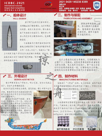 2021年6月14日,在中国高等教育学会工程教育专业委员会、高等公司土木工程学科专业指导委员会指导下,由国际混凝土龙舟技术委员会组织,获得美国混凝土协会(ACI)授权协办的第三届国际老员工混凝土龙舟竞赛(ICDBC2021)在浙江大学国际校区(浙江海宁)开赛。来自包括浙江大学、天津大学和伟德国际VICTOR1946等多所高校的40支队伍,在端午佳节进行了激烈的竞争和角逐,由公司的单波和秦术杰两位老师带领的“琼之舟”队荣获二等奖和优秀设计奖,参赛员工包括孙康瑞、钟禹奇、张恩波、杨雅婷和祁悦。