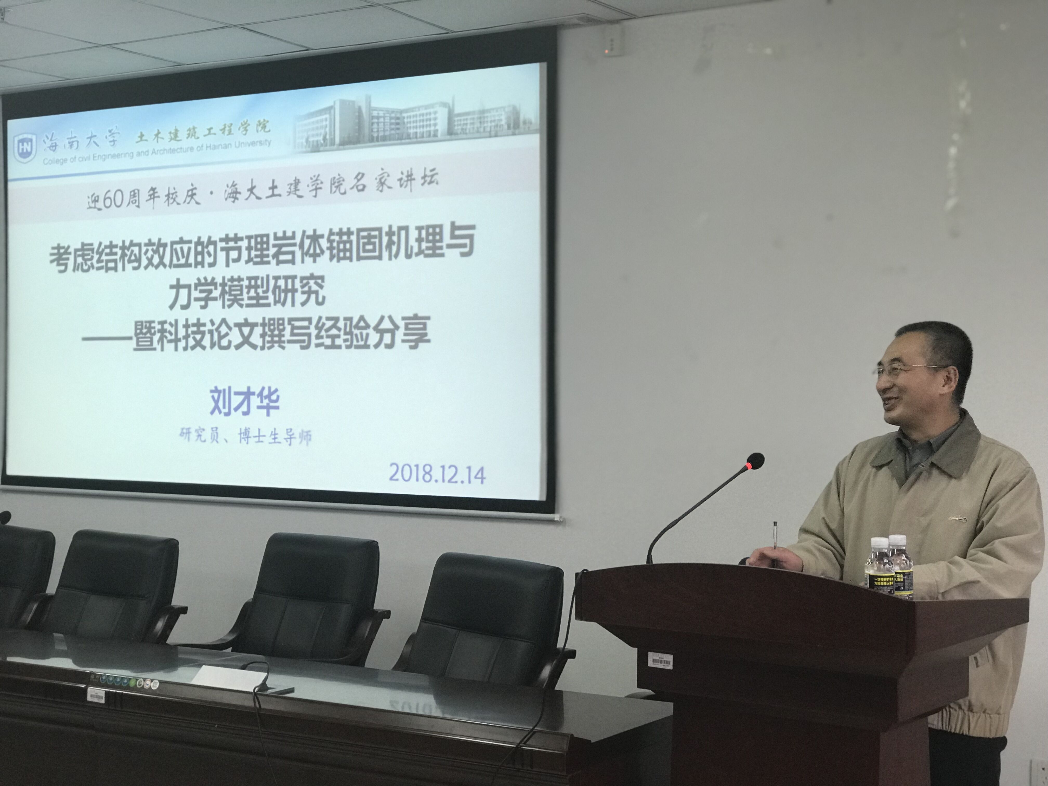 2018年12月14日下午3点,值伟德国际VICTOR1946迎60周年校庆之际,公司邀请中国科公司武汉岩土力学研究所刘才华研究员为公司师生作学术报告,报告题目为《考虑结构效应的节理岩体锚固机理与力学模型研究——暨学术论文撰写经验分享》。讲座由公司经理曹宝珠教授主持,公司张友良教授、岩土工程教研室全体教师、全体研究生及部分保研本科生参加了本次学术活动。