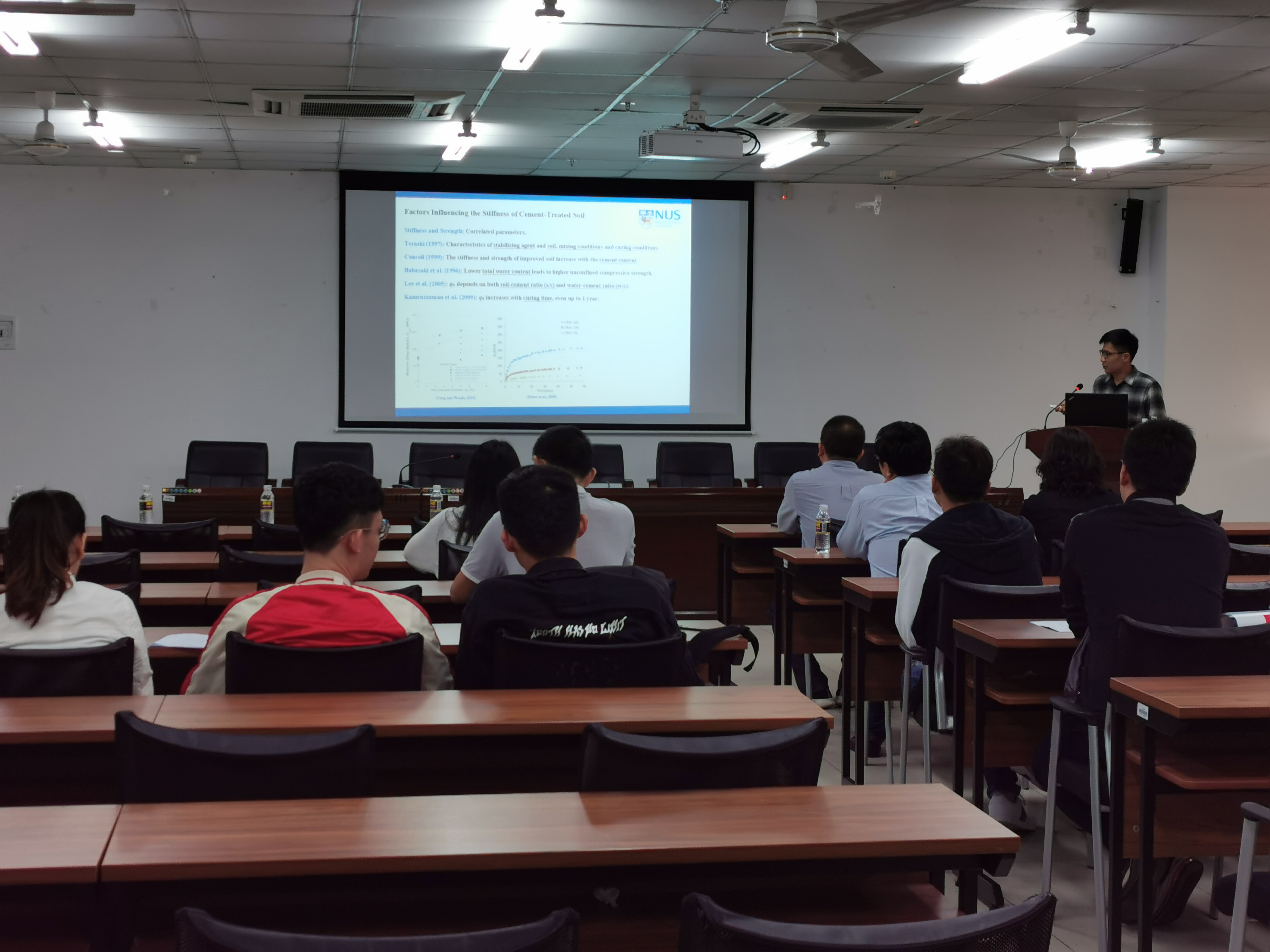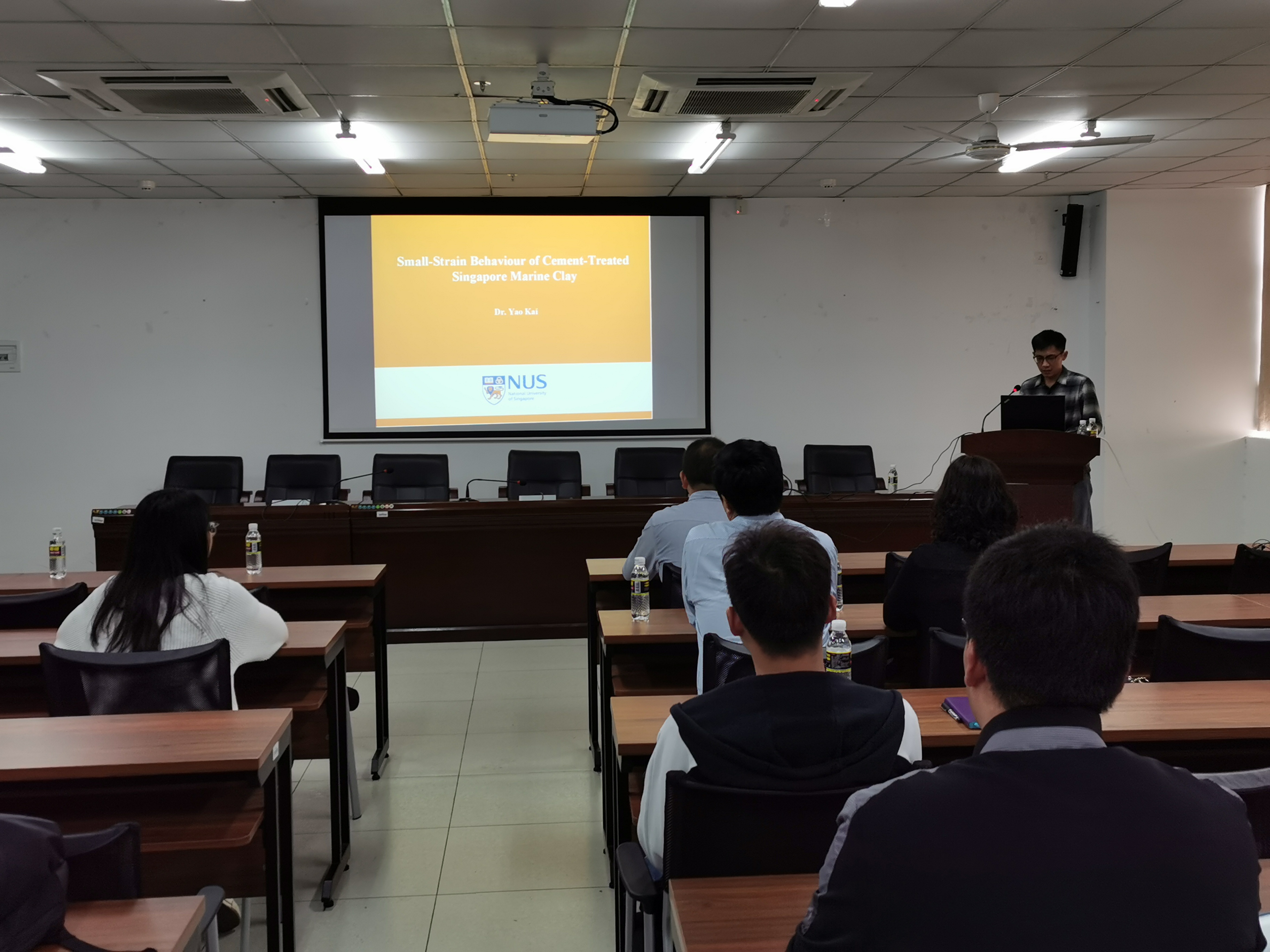 本次报告主要介绍了水泥加固土小应变的研究进展。姚凯博士结合水泥加固新加坡海相软土的特殊性质,详细介绍了对于小应变测试手段(弯曲元,共振柱,局部应变传感器)的改进细节,并运用改进后的研究手段,针对加固后土体进行了一系列参数研究(配合比,围压等)。到会的企业相关负责人、公司师生与姚凯博士充分交流,达成了产学研合作意向。同时,此次报告开阔了师生们的研究视野,也对相关课题的研究提供了新思路。