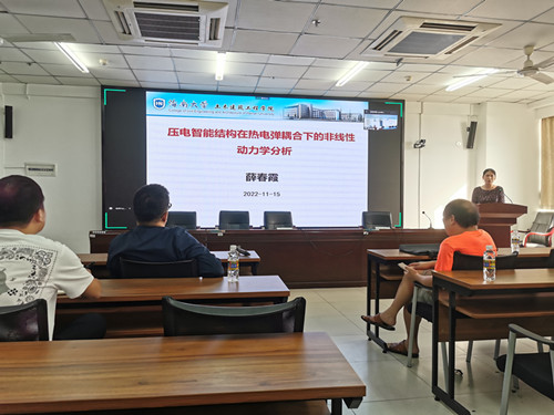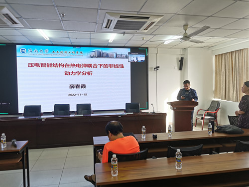 11月15日下午16:00-17:00,公司教师薛春霞教授(2021年10月份入职)在研发楼510做了题为《压电智能结构在热电弹耦合下的非线性动力学分析》的学术报告,会议采用线上、线下相结合的方式进行。学术报告会由辛大波教授主持,他介绍了公司新入职教师系列学术报告活动安排,并介绍了本次报告人薛春霞教授的科研成果相关情况。公司教师、研究生50余人通过现场和腾讯会议聆听了报告会。
