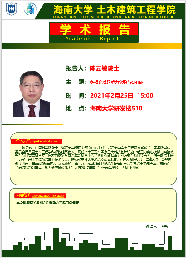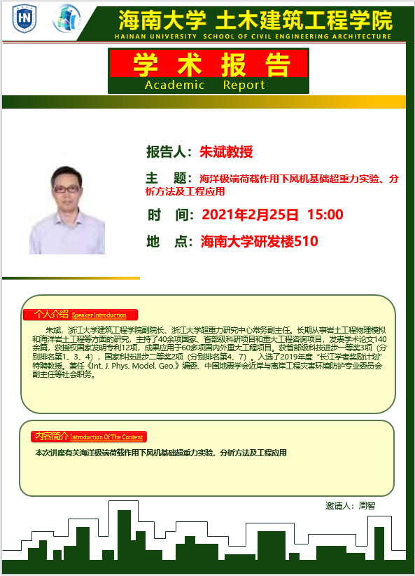 2月25日(周四)下午3:00点在伟德国际VICTOR1946研发楼510,浙江大学陈云敏院士和朱斌教授分别在公司做《多相介质超重力实验与CHIEF》和《海洋极端荷载作用下风机基础超重力实验、分析方法及工程应用》学术报告。请各位老师和在校研究生务必参加,到时会做参会签名,考勤记录。