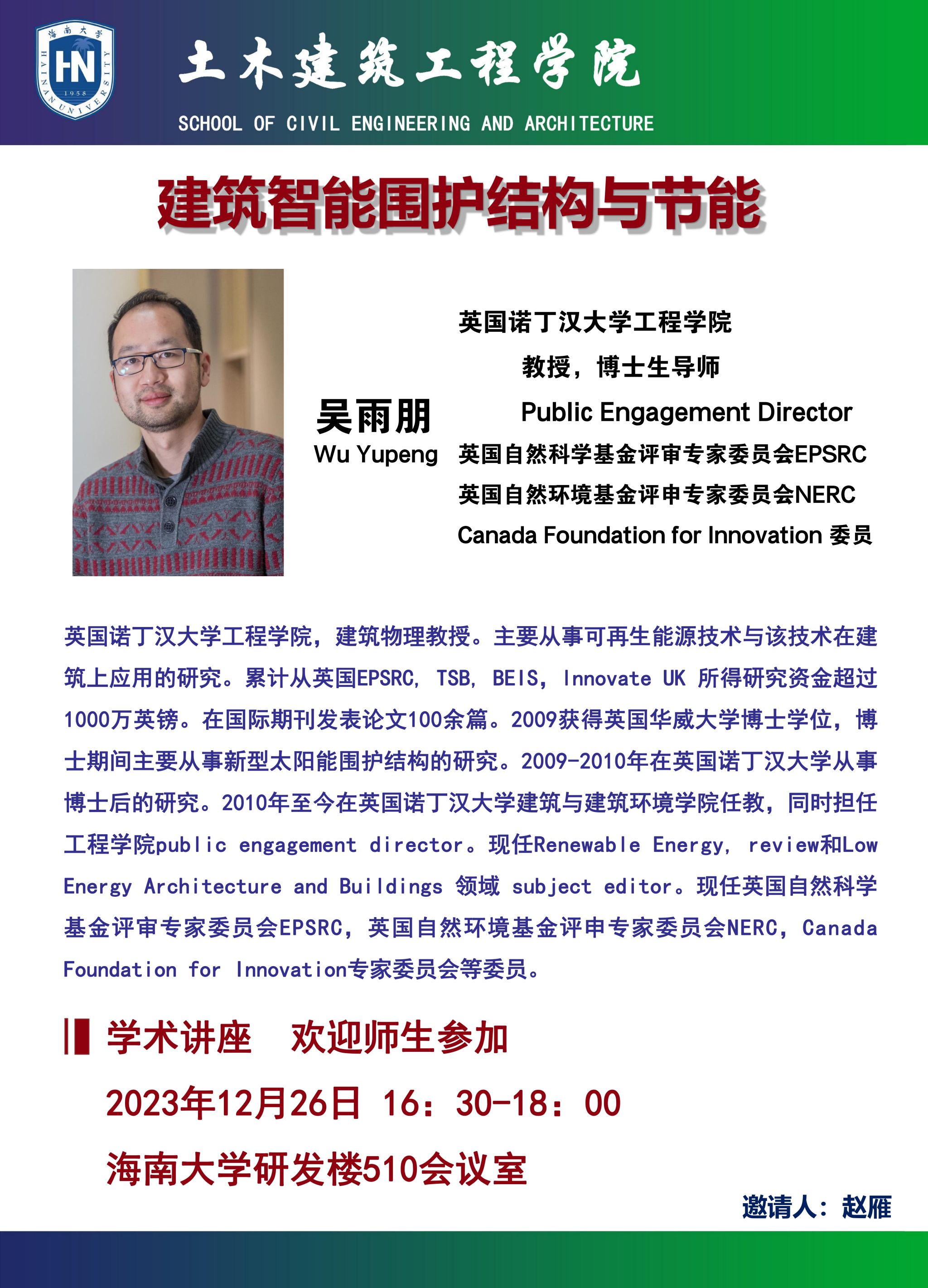 1226日(周二)16:30-1800在伟德国际VICTOR1946研发楼510会议室,英国诺丁汉大学工程公司教授,博士生导师 Public Engagement Director(英国自然科学基金评审专家委员会EPSRC、英国自然环境基金评申专家委员会NERC、Canada Foundation for Innovation 委员),在公司做建筑智能围护结构与节能》学术报告。欢迎有兴趣的师生参加。