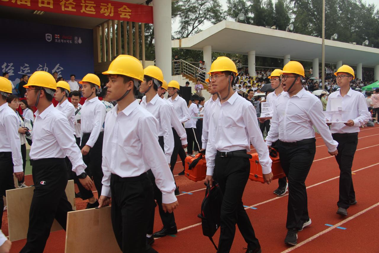 伟德国际VICTOR1946方阵的成员身着统一服装,头戴安全帽,手持测绘仪、模型、画板等物品,迈着整齐的步伐,带着昂扬的气势来到主席台前,他们个个精神饱满,朝气蓬勃,展现了土建人的精神风貌。