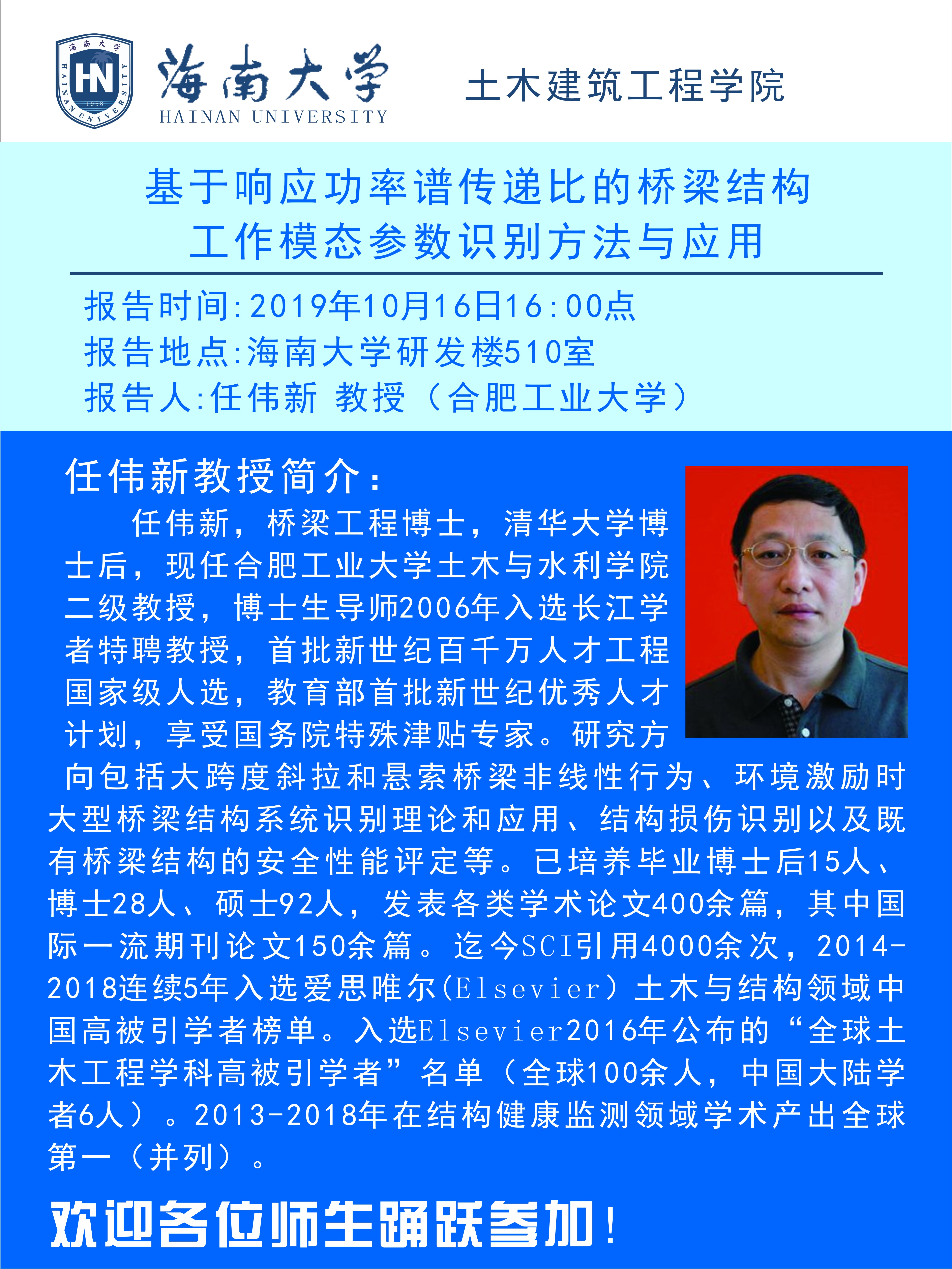 讲座人:任伟新(合肥工业大学土木与水利公司博士生导师,二级教授)